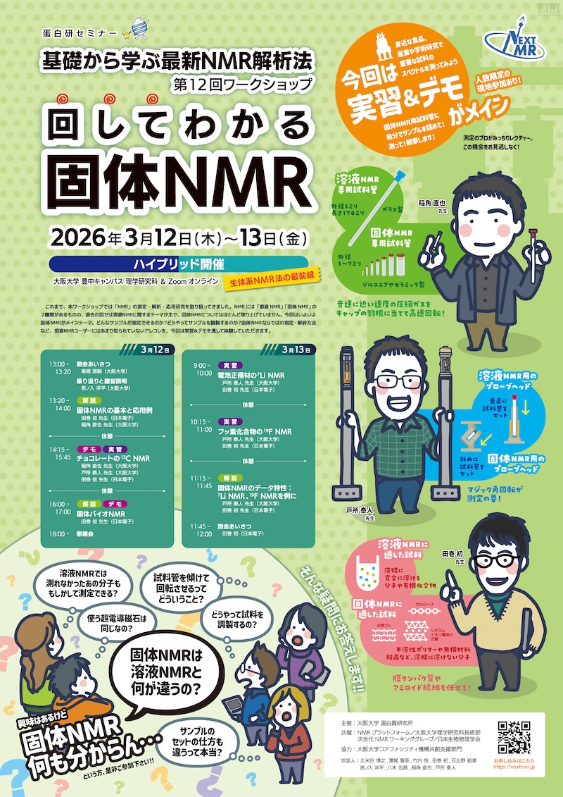 これまで、本ワークショップでは「NMR」の測定・解析・応用研究を取り扱ってきました。NMRには「溶液NMR」「固体NMR」の2種類があるものの、過去の回では溶液NMRに関するテーマが主で、固体NMRについてはほとんど取り上げていません。今回はいよいよ固体NMRがメインテーマ。どんなサンプルが測定できるのか?どうやってサンプルを調製するのか?固体NMRならではの測定・解析方法など、溶液NMRユーザーにはあまり知られていないアレコレを、今回は実習&デモを通して体験していただきます。